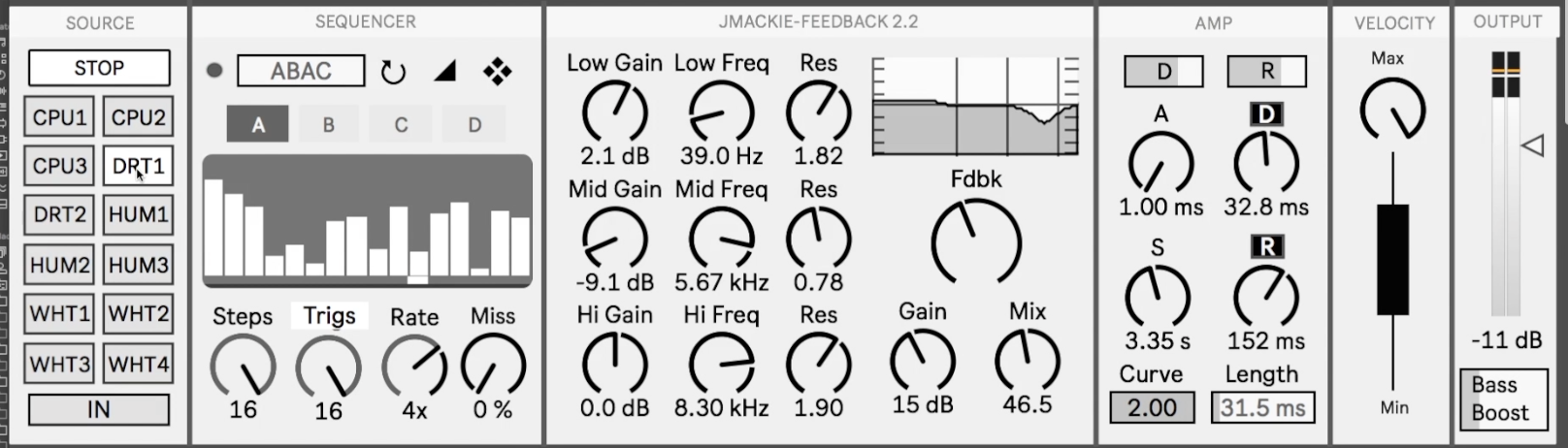 Description: my second device. noise sources found from computer interference and idle synths being ran thru a feedback distortion into an envelope. envelope is triggered by a semi random step sequencer. inspired by ryoji ikeda.