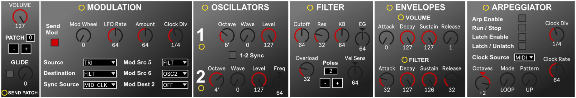 Updated this device tonight due to some user feedback. Most importantly, the patch stored in the software will be pushed out to the hardware on device load. Also, a few bugs were fixed, a couple of things are now done more efficiently, and you can also push any section's values or the whole patch out to the hardware on demand via some push buttons in the UI.