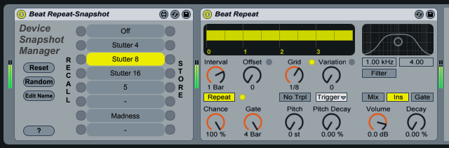 | Description: | Adds the ability to store and recall ‘snapshots’ of Ableton Live devices in realtime (note this is now free, but may not work reliably with Live 9...) |