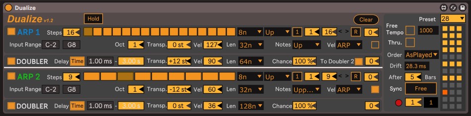 | Description: | Dualize is a dual phrase ARP, with some unique features unlike a typical ARP - Rather than playing the notes up and down an octave, it plays every incoming note (from the input chord) in an order that can be chosen. - The Arpeggiator itself has the usual pattern, speed, direction, repeat, note length, Transpose(+-24 semitones) and Velocity choices. - Each ARP's notes can be fed into a Doubler that basically repeats the ARP note with a delay - The Doubler(delayed) note can be transposed, have a different note length and velocity - The first Doubler(delayed) note can be fed into the second Doubler that can be delayed even further and be transposed. 5/19/24(v1.1): Fixed a bug on stop and restart; Added Delay sync mode(in ms) 2/3/25(v1.2): Added Drift(from Start to End Delay after number of Bars) to imitate Steve Reich's idea See the youtube video(with subtitles) as to how a simple 3 note input chord can generate very interesting ARPs and melodies https://youtu.be/Qd147hwk1mg |