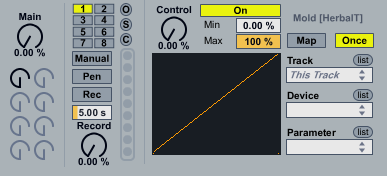 | Description: | Mold v1.1 [HerbalT] This device controls 8 API Parameters from 1 Dial with each API parameter being able to have a graph drawn to define its movement. Preset curves can be drawn manually, recorded over a specified time with the record knob, or automatically draw a linear line based on a set of parameters. Preset curves can be saved to a file and restored. Any suggestions of improvements are much appreciated and please comment or PM me with any recommendations. |