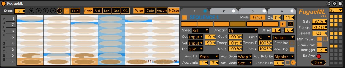 | Description: | A Sequencer similar to the popular Fugue Machine Sequencer for Apple devices that does not have the fancy Piano roll with multiple play heads moving around, but with M4L's Step Sequencer. A few more additions not in the original like: - A pattern for each of the four Sequence - Additional directions (like Random, Drunk, Odd) - Start and End Offset for playing each of the Sequence - A toggle to repeat each note twice - Velocity, Length and Probability settings for each of the Sequence - Octave and Probability setting for each of the note in the Step Sequencer - Gate setting for ALL notes - Each note can be sent to a different Midi Channel or routed to a different Ableton Track like all my other devices - The power of Max for Live and Ableton to modulate/automate almost every control including changing presets! - V1.2 now has Metropolix like features - V1.3 now has built in Scales - V1.4 now has Pulse Gate Pattern and keyboard Transposition plus more Check out the youtube video https://www.youtube.com/watch?v=QSjR7uXjyq8. 10/5/2024: Updated to v1.2 that now includes Metropolix like features 1/12/2025: v1.3 update now adds built-in scale for every Sequencer 10/14/2025: V1.4 update adds many new features |