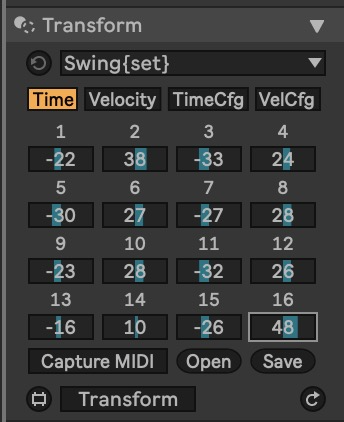 | Description: | Swing{set} is a Max For Live MIDI Transformer for creating dynamic shuffled grooves out of static quantized sequences, leveraging a pair of simple but powerful 16-step offset sequencers. Why? Unlike Ableton's fantastic built-in Grooves feature, Swing{set} is not a black box. What you see is what you get in terms of creating, capturing, and applying rhythmic MIDI offsets. Unlike grooves, Swing{set} can be easily edited once created, with a clear UI indication of what the settings are doing, allowing precise control over behavior. In addition, unlike Grooves, Swing{set} does not require a prior "groove" source to learn from, allowing users to custom design their own off-kilter beat framework from within the UI alone. Swing{set} is designed as a non-realtime MIDI Transformer version of my prior JayMeter device with some design refinements over the prior effort. |