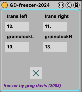 | Description: | gd-freezer is a Max For Live device that I originally created in the Max/MSP Pluggo environment around 2003 & updated for M4L in 2024. This is an experimental plugin that applies granular freezing to the incoming audio input to create thick, cloudy textures. You can control the transposition level of the grains. |
