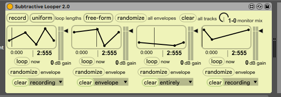 | Description: | A 4-track polyphonic looper that allows you to "subtract" from each loop by adjusting a simple and intuitive amplitude envelope, featuring sample-accurate interpolation written in gen~, choice of free-form or quantized loops, etc. This is a 4-track audio looper that can record and loop any audio you send it, just like a looper pedal. Hit "record" to begin recording into the 1st track and then "stop" to stop recording. Hit "record" again to record into the 2nd track; if loop lengths are set to "uniform" it will automatically stop recording when it reaches the same length as the 1st track. Loop lengths can be quantized to the Live transport by selecting the "quantized" option. The "monitor mix" can be adjusted to blend the looping audio with the audio currently entering the device. The envelope for each track controls its amplitude. In this way, you can carve away at any loops that are playing and "subtract" from them. It can really be fun to see what sort of sounds can emerge when doing this, especially when you just roll the dice and click "randomize". "Loop now" will immediately restart the track in question at its beginning, which can toss things up in another way, giving interesting outcomes. All controls are MIDI-mappable.A 4-track polyphonic looper that allows you to "subtract" from each loop by adjusting a simple and intuitive amplitude envelope, featuring sample-accurate interpolation written in gen~, choice of free-form or quantized loops, etc. This is a 4-track audio looper that can record and loop any audio you send it, just like a looper pedal. Hit "record" to begin recording into the 1st track and then "stop" to stop recording. Hit "record" again to record into the 2nd track; if loop lengths are set to "uniform" it will automatically stop recording when it reaches the same length as the 1st track. Loop lengths can be quantized to the Live transport by selecting the "quantized" option. The "monitor mix" can be adjusted to blend the looping audio with the audio currently entering the device. The envelope for each track controls its amplitude. In this way, you can carve away at any loops that are playing and "subtract" from them. It can really be fun to see what sort of sounds can emerge when doing this, especially when you just roll the dice and click "randomize". "Loop now" will immediately restart the track in question at its beginning, which can toss things up in another way, giving interesting outcomes. All controls are MIDI-mappable. |