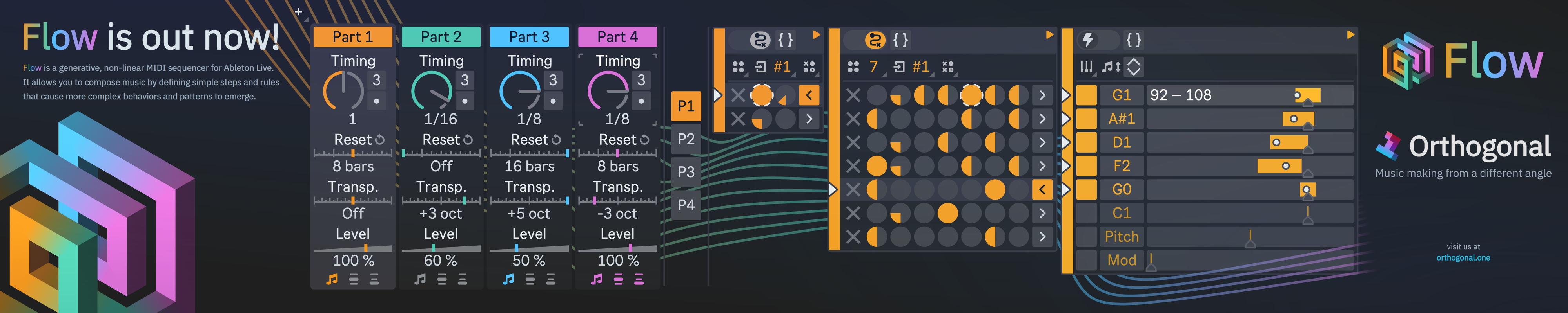 | Description: | Flow is a generative, non-linear MIDI sequencer for Ableton Live that allows you to compose music by defining simple steps and rules that determine how the music will change over time. You define the rules, and Flow executes them, producing infinitely long and varying musical patterns. Flow offers a new way of making music that is based on generative and organic principles. It lets you explore new possibilities beyond the conventional approaches of linear sequencing. Whether you want to create soothing ambient soundscapes with complex generative chords, go wild with fast and chaotic breakcore rhythms, or craft melodies and arpeggios that reharmonize with unpredictable yet harmonious chord changes — Flow can handle all of these, and anything in between. Featured in MusicRadar and MusicTech: https://www.musicradar.com/news/flow-generative-midi-sequencer-ableton-live https://musictech.com/news/gear/orthogonal-flow-generative-algorithmic-sequencer/ |