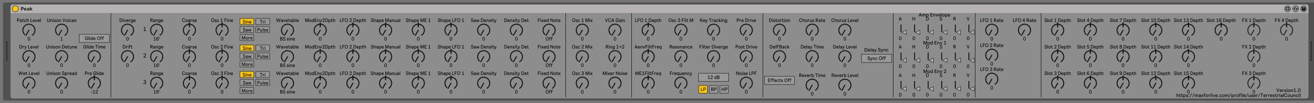 | Description: | Full MIDI control of your Novation Peak. Features: -All useful parameters fully controllable within Ableton just like the stock synths (sorry, I haven't included the extra wavetables in the newest Peak firmware as at the time it was buggy, so I'm still on an old firmware. Everything else should work fine, including the built in wavetable list) -Correct scaling of parameters in the automation lane -NRPN parameters (where applicable) are used for the finest possible control Caveat: Due to MIDI spec limitations, you should limit to controlling 3-4 parameters at once, to ensure all the data is sent to the synth. If you like this device feel free to donate by buying one of my albums (the older ones are pay what you can): https://terrestrialcouncil.bandcamp.com/ |