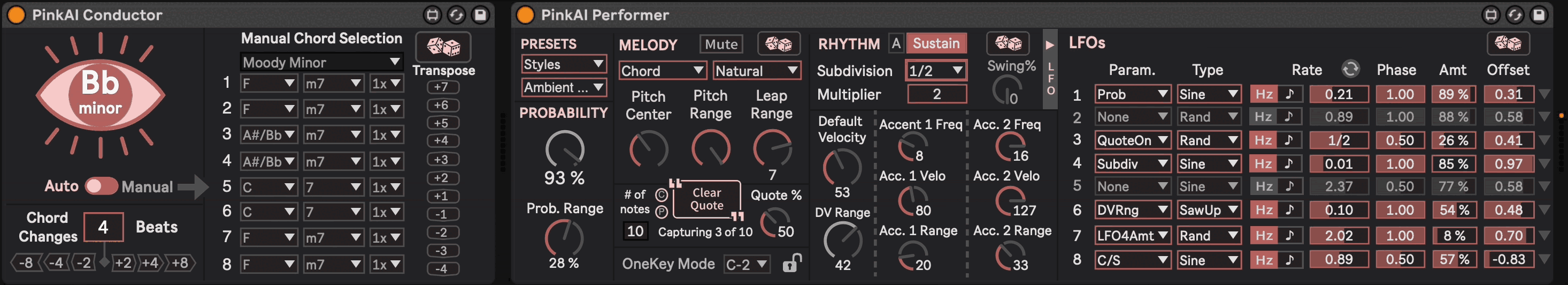 | Description: | PinkAI Generative Composer is a groundbreaking modular generative MIDI device for Ableton / Max for Live. PinkAI is the only plugin that synchronizes instruments across as many tracks as you want, with all performing to the same generated chord. Whether you want a full symphony orchestra, jazz trio, solo piano performance, or anything in between, PinkAI creates and performs multi-track compositions in real time. Generate melodies, rhythms, and entire songs with the click of a button and interact with parameters in real time. Create endless soundscapes, or easily record and shape your output for full ensembles or single instruments. The PinkAI Conductor Module auto-generates chord sequences based on training from 5,000+ songs (or allows a user-programmed chord sequence), and the PinkAI Performer Module (containing user-controllable parameters for melody, rhythm, probabilities, and built-in LFOs) can be instantiated on any number of Live Tracks to create a fully automated, generative composition. Demos, tutorials, and sound/music examples can be found on the website or on our social media: Youtube: www.youtube.com/@pinkaimusic Instagram: www.instagram.com/pinkaimusic |