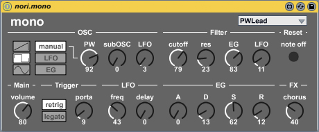 | Description: | mono is a basic monophonic synth which specialized in portamento/legato rendition. specs: 1 OSC saw/square with pwm/sine 1 SubOSC 1 LFO with sync to modulate filter, amp and pwm 1 EG with sync to modulate filter, amp and pwm 1 Chorus effect listen the demo sound here: http://kodamahikari.com/software update v1.1 Adjusted EG Curve. |