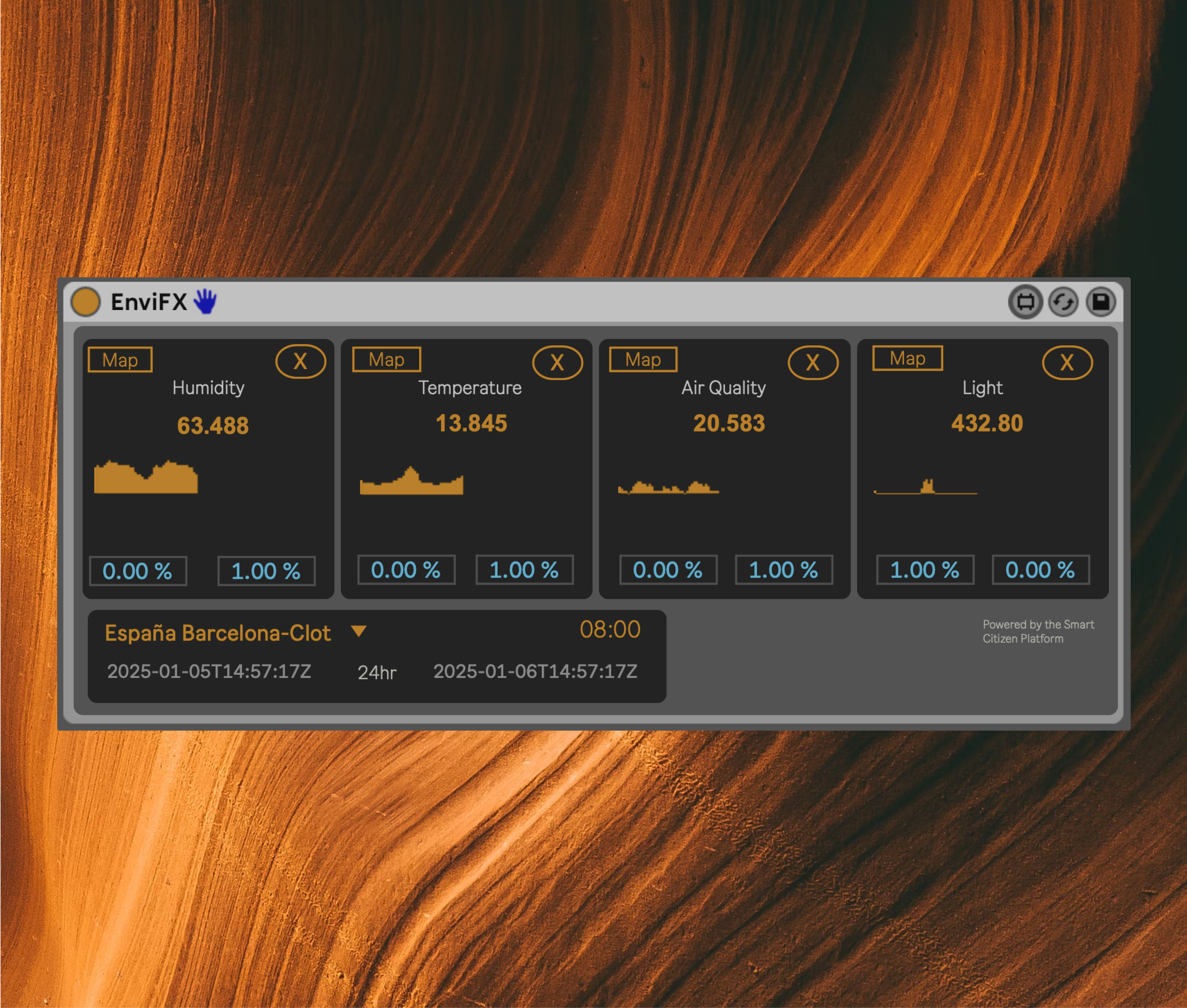 | Description: | EnviFX is an FX device that maps environmental data to any parameter in Ableton. The environmental data includes Humidity, Temperature, Air Quality and Light readings fetched from the Smart Citizen Platform. Installation: Unzip the file inside the Max Audio Effect folder. There are two JS files that need to be in the same directory so the device can function. |
