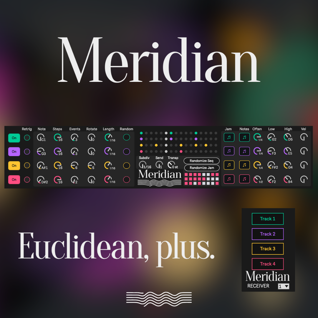 | Description: | Meridian is a MIDI sequencer that integrates Euclidean sequencing with generative controls, enabling the creation of new patterns on the fly and the continuous evolution of existing ones in novel and musical ways. v1.5 Update Overview video: https://youtu.be/3VCX1Cp2Kpc Original Overview video: https://www.youtube.com/watch?v=rQN9olZyO4k Set the frequency at which randomizations will occur, specify low and high note limits, and let the process unfold. A velocity randomizer adds a human touch to the outputted notes' velocities. While there are numerous Euclidean sequencers available, Meridian distinguishes itself not only through its optional generative controls for real-time sequence generation but also by its ability to generate authentic polyrhythms, unlike the Euclidean MIDI device integrated into Live 12's MIDI tools. With the stock Live 12 Euclidean device, a 5-step pattern will repeat indefinitely until the clip is full, at which point it will resume from the beginning. In contrast, Meridian's four tracks each have their own clock, ensuring that a 5-step sequence will loop as soon as its five steps have finished triggering. Adding a 16-step pattern on another track will allow the polyrhythms to make themselves heard, as the 5-step pattern accents different beats of the 16-step pattern each time it plays. The two patterns will not synchronize again until 80 steps have passed (5 steps x 16 steps). If this is confusing, I walk you through it in the video. :) Also, you can store your favourite patterns within the preset matrix or even store an entire set's worth of patterns and switch between them with ease. I believe this device inspires both creative studio work and live performances. Furthermore, it features nine banks of mappings for the Push, enabling users to operate the device without ever needing to turn to their laptop. Key Features: Manage four tracks, each with its own pattern from the same device. Each track comprises settings for note duration, step length, the number of events (notes), pattern rotation, and randomization. Additionally, per track is a hardware-inspired Retrigger button, enabling real-time adjustment of the rhythm or the injection of intriguing stutters, fills, or other rhythmic elements. Jam mode facilitates the evolution of each of the four tracks over time. Specify the frequency at which you wish to modify your settings (1/4 note, 1/2 note, bar), and let the process unfold. Note Jam mode provides similar functionality, but with the actual note values changing over time. Set a low and high note range, and the note will change at the specified frequency (1/4 note, 1/2 note, bar). Per-track velocity randomization adds humanization to your patterns. The Preset panel enables the storage of up to 32 patterns for later retrieval, facilitating the saving of favorite rhythms or the playback of a live set of material. Global controls allow adjustment of the global subdivision of all four tracks, as well as two additional randomize options to randomize all four tracks' sequence or generative parameters at once. New in v1.5 - send MIDI data from Meridian to any other track(s) in Ableton Live via the included companion device, Meridian Receiver. Big thanks to Augustine from VSTOPIA for his help with some UI tweaks and pattrstorage issues! Change log v1.5 Introduced a companion device, Meridian Receiver, allowing to send MIDI data from Meridian to any other track(s) in a project. Overhauled the user interface, making things more ergonomic. Fixed an issue with randomize all buttons when using more than one instance of Meridian in a project. v1.1 Added the ability adjust the note lengths individually for each of the four tracks. Added a global transpose function to shift the entire sequence up or down by up to 24 semitones. Added basic Push 3 Standalone support. I've not yet been able to bring the graphical sequencer visualizer over to the Push, but all of the functions and controls of Meridian are now functioning both on Push 2/3 as well as the Push 3 Standalone with nine banks of controls: two banks per track, and an additional bank to handle global parameters. |