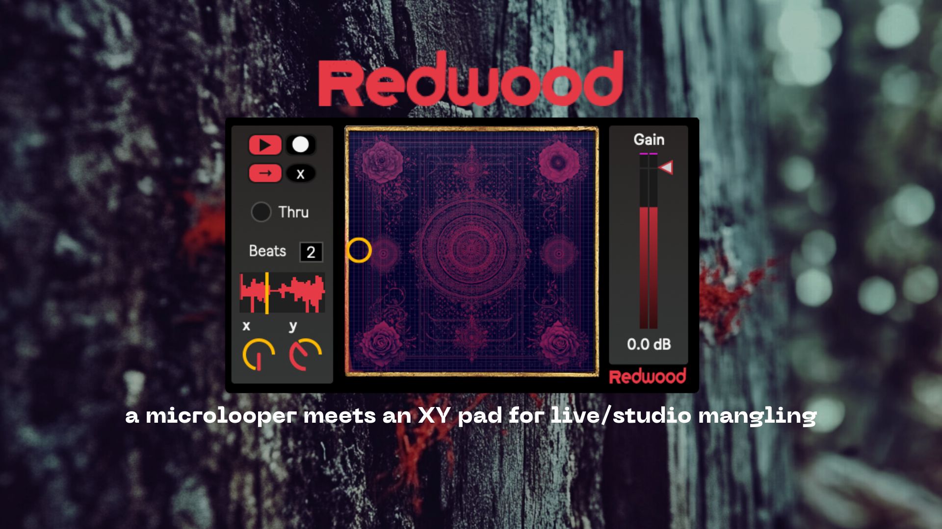 | Description: | Redwood is a micro-looper attached to an XY pad which adjusts the loop's pitch and length in musical ratios. Redwood was inspired by Radiohead performances in the early 2000s around the time that Kid A came out. Essentially, Jonny Greenwood would sample little bits of Thom's vocals with a Korg Kaoss Pad and manipulate them in real time - stretch them, repitch them, just turn his vocals into an instrument of sorts. The left side of the device contains typical looper controls. The thru button allows audio to pass through the device - useful if you're singing live and just want to grab bits perhaps at the end of a phrase. Set the record length (in beats - this device shines with shorter audio chunks rather than longer loops), hit record (the record will begin on the next beat, and press play and you've got yourself a micro-loop. If you leave the play button turned on, the loop will begin playing as soon as the recording has stopped, which again, for live use, I think is the way to go. To the right of these looper controls, we have the main component - the XY pad. Out of the box, X is assigned to your MIDI keyboard's mod wheel and Y is assigned to the pitch bend wheel. If you, like me, use a small Akai MPK Mini keyboard, the mod wheel and pitch bend wheel are actually a four-way joystick which translates perfectly to this device. Though you can also assign whatever physical controls you like via the two small x and y knobs in the bottom left corner. Or just use your mouse - no rules. The X plane (left to right) controls the length of the loop. All the way to the left (0) will loop the entire recorded audio. As you move to the right, around the middle, you'll hear a halved version of your audio mixed in with the original length, and as you move a bit further to the right, that original full loop will fade out and you'll only hear the halved version. Then as you get to the end, you'll hear a smaller snippet - a quarter of the original loop you recorded. The Y plane (up and down) is for pitch-shifting combined with a touch of bit reduction at the more extreme settings. This is sort of modeled after some of my earlier devices, like Ambi, where the bits are reduced a bit as you shift higher and lower and it kinda gives a feeling of the way the fidelity of something recorded on tape is gonna change as you get to more extreme values. Also, the pitch shifts not just through every available semitone, but in musical degrees - I've opted for fourths, which means that there's a very good chance that the sample is going to sound "good" or in key as you shift it up and down in the context of your song. This was of course inspired by the Chase Bliss MOOD pedal, which has a similar pitch shifting algorithm. That's the gist. I think a nice way to play this live is to map some key or button to the record button, and then manipulate the XY pad however you like - either with a mouse, mod/pitch wheels, your MIDI controller, etc. As you sing, just grab a little tiny chunk of the vocal and then manipulate away. To go further, you could map another key or button to the reverse control to be able to manipulate that, and map a dial or slider to this gain over here which affects just the loop's volume, so you can fade the effect in and out along with the song. While I made this device with vocals in mind, I also found some pretty interesting results using drum loops and synth bits.. experiment and see what you find! I hope you find this useful. It's an effect I love and I like that this device is pretty simple to use, has a lot of various sweet spots, and I hope you find some inspiration. |