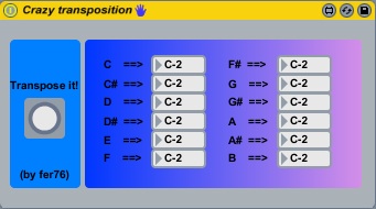 | Description: | With a bang, it generates a random midi-pitch transposition for each note. Visualization of the notes that replace to the originals. Try it with a chromatic scale! |