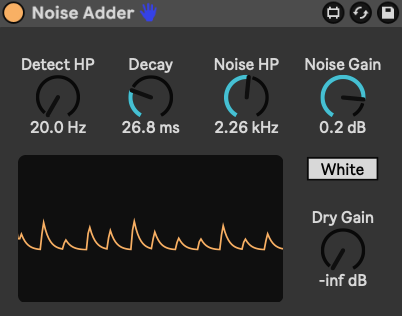 | Description: | Adds white or pink noise that follows the input’s envelope. Tweak Detect HP to dial in how the envelope responds. |