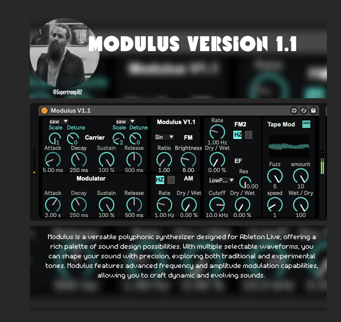 | Description: | Modulus is a versatile polyphonic synthesizer designed for Ableton Live, offering a rich palette of sound design possibilities. With multiple selectable waveforms, you can shape your sound with precision, exploring both traditional and experimental tones. Modulus features advanced frequency and amplitude modulation capabilities, allowing you to craft dynamic and evolving sounds. The integrated envelope filter adds another layer of control, shaping the attack, decay, sustain, and release of your sound with finesse. What sets Modulus apart is its flexible modulation options. Both the frequency and amplitude modulations can be independently set to as an LFO frequency rate or synced to Ableton Live's tempo, giving you the power to create rhythmically complex patterns or fluid, free-running modulations. Whether you’re crafting deep basses, lush pads, or intricate leads, Modulus delivers a robust toolset for the modern producer. If you like my work and wish to collaborate or contact me, the best place to do so is through my instagram @supertramp162 Link to short sound demo here: https://www.youtube.com/watch?v=MkNtWUammLE |