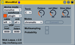 | Description: | MonoMIDI is a step sequencer to be controlled via the monome. It's based on manipulating Live MIDI clips. Part of the code base was taken from the Ableton Clip Step sequencer, thx for that. the features in a nutshell: - support for MIDI clips with up to 64 steps (1 step = 1/16 note, which makes it 4 bars) and 49 drum pads (or 7 octaves when using scales) - Full scale support including chromatic mapping and other custom scales - Scale conversion - advanced duplication facilities for partial note sequences - supports velocity and note placement humanisation within range ("note pull/push", low/medium/high velocity) - MIDI overview mode for selection of MIDI clip section to be controlled - Multisample mode (8 samples per note lane) and variable probabilities per sample - Probability mode (driven by note velocity) - Adjustable note length - Playhead visualisation - works standalone and integrated into MonoLive (see MonoLive documentation) The full documentation can be found here: http://www.mrflakey.com/wp-content/uploads/2010/04/monomidi_docu.rtf |
