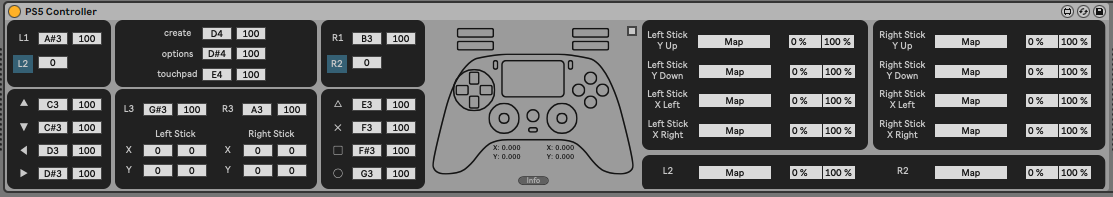 | Description: | Use your PS5 Controller as a midi controller. Each of the 4 directions on both the left and right stick and both the L2/R2 triggers can be mapped within Ableton. The L2/R2 triggers have 3 configurations. Map only, note only and both map and note output. Press the coloured button to cycle through configurations. Toggle the mapping panel with the button in the top right of the device. Each directional button, action button, 3 L/R buttons can send a specified note at a specified velocity. |
