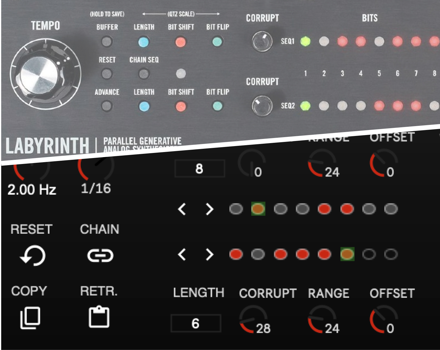 Description: Labyrinth Seq is a dual generative Midi sequencer freely inspired from the sequencer of the MOOG LABYRINTH semi modular instrument released in 2024. It consists of two generative sequencers which use chance operations to construct two unique paths that twist and curve around each other, forming mesmerising polymetric melodies. The generative nature of this sequencer is loosely reminiscent of the Buchla 266 Source of Uncertainty or Music Thing Turing Machine.