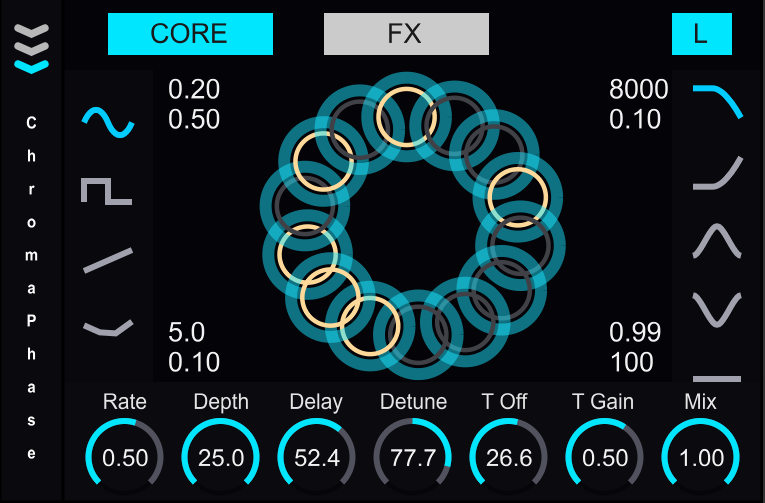 On the Core page, you’ll find straightforward controls for Rate, Depth, Delay, Detune, Tap Offset, Tap Gain, and Mix—everything you need to craft anything from a gentle doubling effect to soaring, cinematic sweeps. Flip over to the FX page to dial in creative elements like frequency shifting (with multiple voices), saturation, and final output gain. Edge-of-screen boxes let you reach in and tweak wow, flutter, filter cutoff/resonance, and feedback behavior. Each parameter reacts visually: turning up Saturation bathes your voice circles in warm yellow hues, raising Frequency Shift turns affected voices dark grey, and pumping Feedback wraps everything in a soft halo.