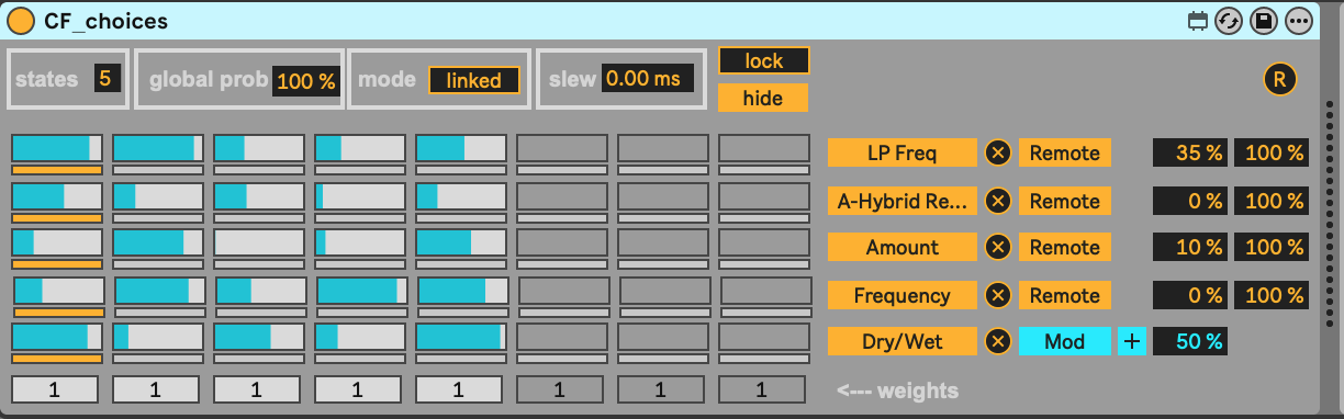 | Description: | "Choices" is a free Max for Live device that allows you to map up to 5 parameters, and store up to 8 sets of values for these parameters. Then each incoming note will make a choice between these values, according to their respective "weights". You can either trigger whole columns or independent values. You can morph between changes. Video "demo" : https://www.youtube.com/watch?v=CDEGoGVx6X4 Change 20250623 : added Push support. |