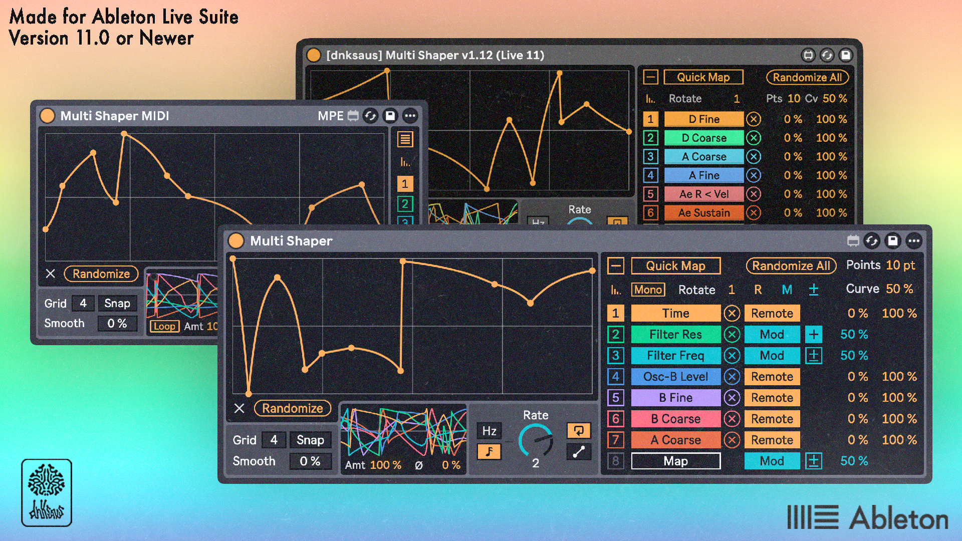 | Description: | Multi Shaper is an adaptation of Live 12's version of Shaper, where in this version you can randomize 8 separate shapers at once and quickly map them all to parameters without going back and forth between your plugins and the modulator. You can switch between loop mode and manual mode, where loop you can control the rate of all the shapers, and manual where you automate yourself. The Randomize function can be adjusted with the "points" parameter, which controls how many segments will appear in the generated shapes. This will always plot at least one minimum value and one maximum value. The "Curves" parameter determines the maximum range of how curved each segment might be. You can also set all modulators to be “Remote” or “Mod” mode with the R & M options, as well as all mod mode’s polarity with the +/- button. There is also a separate MIDI version included, for triggering the curves via MIDI note input. The modulation amount in this version can be controlled via velocity if desired. I've also included Live 11 versions, which include everything from the Live 12 versions except features that relate to Mod mode mapping; Live 11 only supports Remote mode mapping. |
