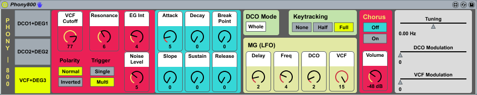 | Description: | A rendition of Korg's Poly-800, an 8-voice synth with 4 square wave oscillators (DCO) per voice. These are pitched in octaves and labeled using common organ terminology, i.e., 2, 4, 8, 16. There is a DCO1 and a DCO2. With the DCO2 enabled, the synth becomes 4-voice polyphonic but yields up to 8 oscillators per voice. DCO2 can also be detuned to add thickness to the sound. So, it's particularly good for leads and basses. Each DCO has a 5-stage envelope - attack, decay, slope, sustain, and release - as does the VCF. There is also a single LFO that can be applied to both the DCOs and the VCF. The only effect is chorus, which really helps to liven up the monophonic sound of the instrument. |
