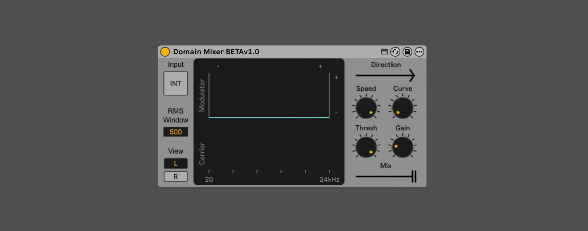 Description: Domain Mixer takes a traditional stereo two-channel mixer and turns it on its side. Now, instead of blending audio amplitudes, the spectral content of one signal is modulated by the amplitude envelope of another — the frequency domain mixed with the time domain.