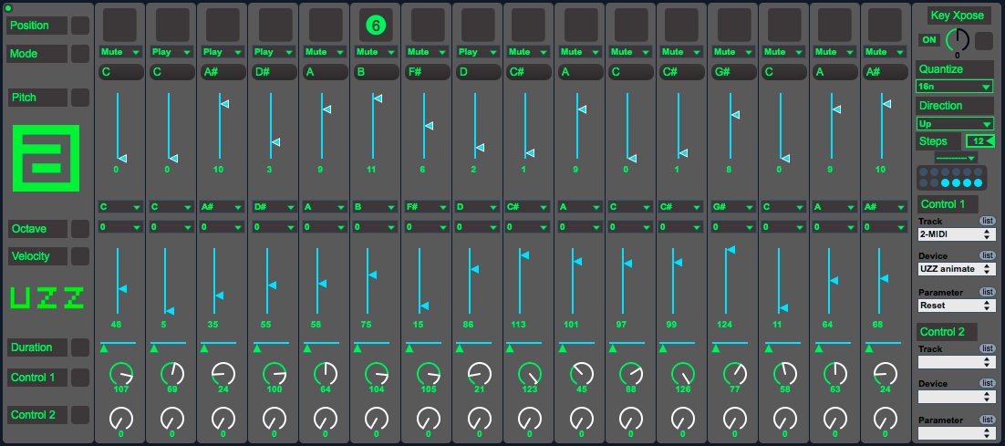 | Description: | Version 0.5 fixed remote control remote buttons fixed ---- Version 0.4 Fixed StartUp setup add uzz logo ---- Version 0.3 Fixed the Xpose add a quantize tempo 1/1, 1/2, 1/4, 1/8, 1/16, 1/32 add a directon for up, down, u p&down add numbers in steps ---- Version 0.2 Problem with note slider fixed. Some wrong text in +info fixed ---- Version 0.1 start version launched ---- Features: UZZ inspired on Ultimate Step Sequencer (USS) Created by Len Sasso. Two controller values per step for remote control live parameters Step play, mute and options Keyboard transpose Save all the parameters vía presets object Keyboard transpose TODO: Loop start Independent step timing Step Skip mode option Scaling and offset for pitch and Velocity Swing Option If have any idea for a better secuencing mode or want to colaborate in the UZZ please send me an email to : animatek909@gmail.com Thnxs to Manuel Palma for the counter integration, direction, and stepSize!! Thnxs to LSKA for the control signal and scale fix! |