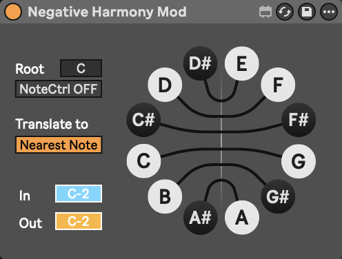 | Description: | This is a mod on the v0.2 of Demian's Negative Harmony you can find in the link below. This device was entirely conceived and designed by Demian. I've just rebuilt the circle and its GUI to make it English notation with Ableton Sans type font, and allow a couple of alternative ways to change root, being these (besides the original dragging the Root box): - By clicking on the notes themselves within the circle (as suggested by jarekmn), - By dragging the circle links either horizontal or vertically. I also drew a smooth line to show the current axis about which the mirroring is being made. Original device: https://maxforlive.com/library/device.php?id=4645#26829 |