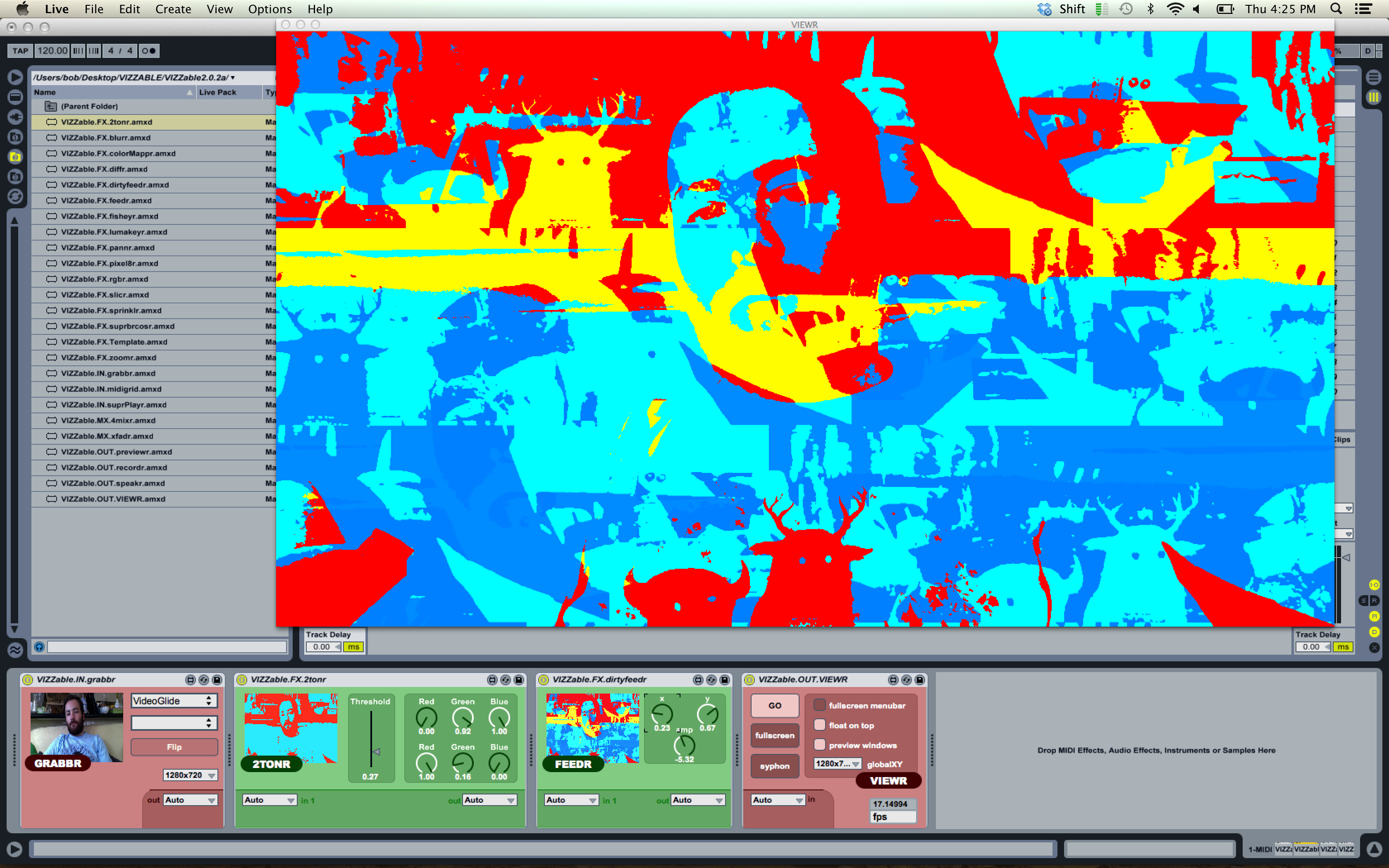 | Description: | VIZZable 2.1 for everything VIZZable go to http://vizzable.zeal.co Robert Jarvis ZEAL.COM //Installation Place VIZZable folder anywhere on your hard drive. Drag plugins from the Ableton browser or your file system, into your live set. //Tips All the plugins have help associated in lives built-in help thingo. Video files should be in quicktime format. A good rule of thumb is to use the photoJPEG codec at 74% for the best compromise between quality and performance. //Thanks Chris Gough for his fantastic auto-connect system, preview windows and chain router device. Mike Todd, Fabrizio Poce, Leon Trimble, Ned Rush and everyone on the JitterInMax4Live group for their knowledge and enthusiasm. David Avila for his fantastic JS objects used in the Suprplayr. Stefan Brunner for his keen bug squashing. Wesley Smith for pouring his brain out on the cycling 74 forums. Sam Tarakajian for his unbelievably useful tutorials (http://www.youtube.com/dude837) This software is released for free. You are free to edit and/or redistribute it. You may not sell it, take credit for my work or redistribute it with out attribution. If you edit it and redistribute it you must let others do the same. If this software breaks your computer, it's not my fault. If it makes you rich and/or famous please buy me some land in Tasmania. Join the community here: http://groups.google.com/group/jitterinmax4live- hit me up: bob@zeal.co |