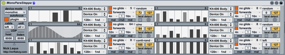 | Description: | MonoParaSteppa is a parameter sequencer, to be used with or without Monome. Partly based on the 3x Parameter Sequencer by Ivehon, thx. There is a MIDI version as well (MonoParaSteppaMidi, see MIDI device section) Main features: - Step Sequencer Control of up to 6 device parameters and up to 64 steps - Random timing between steps - Continous-random mode - Timing multiplier for longer intervals up to 32 bars - Quantization setting - 2 Glide modes (fast and slow) - Full synchronisation between device and monome - Multiple sequencer directions - Randomisation of step intervals, quantization and time multiplier - Beat detection mode (adjustable minimum velocity) Especially interesting is the option to change the boundaries for value range as well as for the random timing (kind of similar to dschihadelay). Pls note that sometimes, parameters are not picked up when adding MonoParaSteppa to the track before the other device. Documentation coming soon, until then, have a look at http://mrflakey.com UPDATE (v1.1): - Mixer device parameters can be modulated (Track volume, Panning, Sends, crossfader, cue_volume) - Support for drag'n'drop LFO waveforms (just drop on respective device section) - Support of sine, triangle and square waveforms (via drop-down menu) UPDATE (v1.2): - parameter assignments are now recalled when loading a set (as well as all other settings, sequences etc.) UPDATE (v1.3): - sequence start can be synced with loop start (use second toggle to activate) |