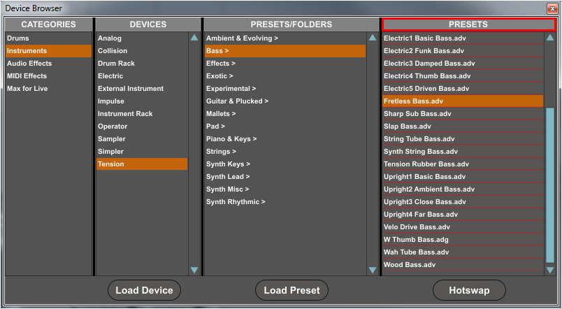 | Description: | Device Browser is a MIDI (or key) controllable browser for Live's devices. The browser is housed in a floating window that can be closed/opened via MIDI (or key). Since M4L does not have native access to Live's browser methods, ClyphX (v2.2.4 or later) is required to use this device. You can download ClyphX here: http://beatwise.proboards.com/index.cgi?board=clyphx KNOWN ISSUES: - It is not possible to hotswap devices on the same track that the Device Browser is loaded on. - If your cursor is over the floating window upon performing a load operation, you may see a busy cursor icon until you move your cursor away from the floating window. - The device does not currently work with Live 9.5 and later. |