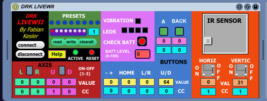| Description: | DRK Livewii is a piece of software that takes total control of the nintendo wiimote and transforms it into a bluetooth, wireless instrument-midi controller. I thank to Takeru Kobayashi, the author of "tk.wii", the external object wich recognizes the wii inside max and made technically possible to imagine and create Livewii. I have mapped all the wii variables and derived them to differents modes of control. All the important values and switches are live objects, so they are full automable and could be midi controlled, including the electromagnetic movement sensor and the infrared sensor. VIDEO: http://youtu.be/JuHEgAqvHBM MORE VIDEOS, HELP, ABLETON TEMPLATE, MAX AND EXE VERSIONS HERE: http://fabiankesler.blogspot.com.ar/p/max-msp.html Author: Fabian Kesler - fvkesler@gmail.com |