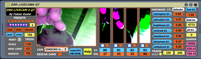 DRK LIVECAM4 (Max version for PC, look for Quick Time version in my other plugins to use with MAC) transforms your camera into a 4 continuous midi sensor-controller.