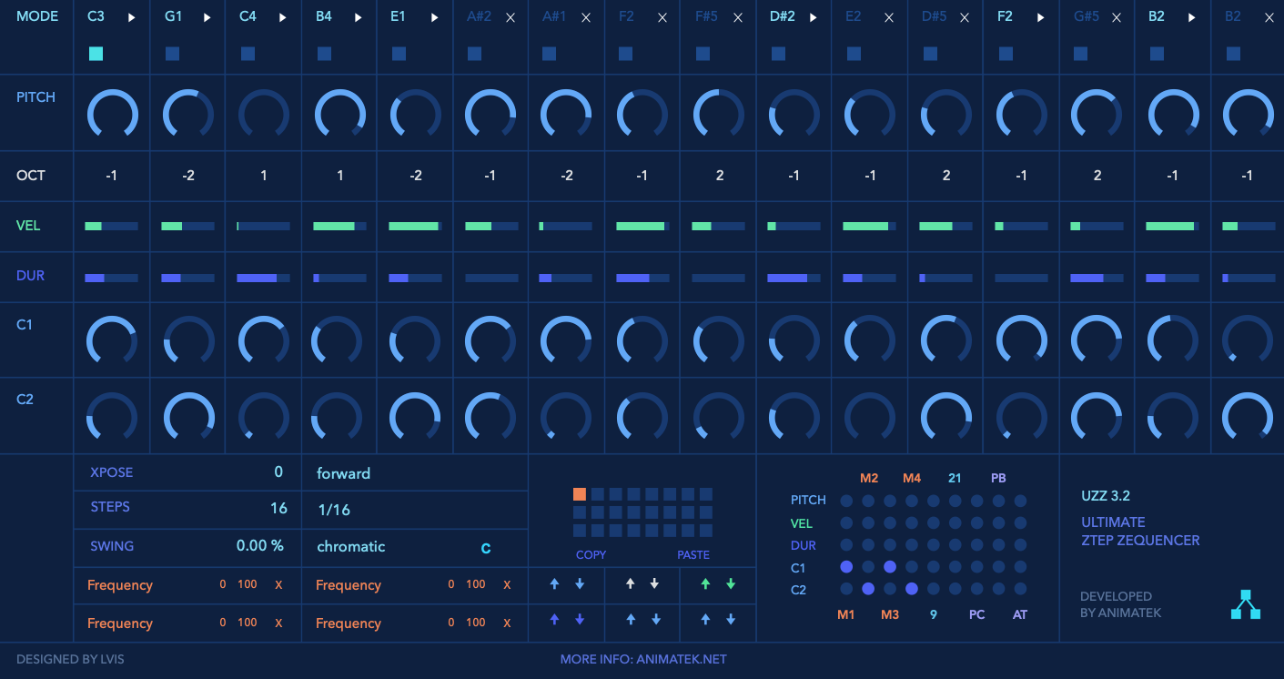 | Description: | NEW IN UZZ 3.2 Remove the reset bar, now automatically the device adjust the measure of the secuence. The menus of the direction, measure, scale have changes to umenus. many problems with the interface have been corrected. New animatek logo added. The installation is now a pack that will be installed in your PLACES/PACKS New in 3.1 General and presets improvements: The code has been reduced by 48% and now it is super fast. Issues in the interface have been corrected. Now you do NOT need to use SHIFT + click to save the preset, the preset in which you are working is automatically stored when you move to the next one. It has included an option to copy and paste the presets that make the work more fun and fast. Compatible with Ableton Live 10 and with PUSH banks (Experimental). -- UZZ 3.1 is a step sequencer created in Max for Live for Ableton. With this device you can create amazing sequences by modifying their parameters randomly and also you can automate any parameter of Ableton using a powerful matrix of modulation device. Step Parameters: UZZ 3.0 is a 16-step sequencer where you can adjust each parameter in every step independently. Also, all parameters can be changed randomly with very few clicks. Awesome results really quick!!! Mode : In this section you can see information of the corresponding step note and enable or disable the step with the cross or play button. Pitch : Here you can change the step pitch range from 0 to 12 (full octave). Octave : Change the octave of the step, five eights are available from -2 to 2. Velocity : Change the range of the velocity of the step, from 0 to 127. Duration : The duration can also be adjusted in each step, 128n, 64n, 32n, 16n, 8n, 4n, 2n. Controls : With these two controls you can modulate any of the four maps controls or any destination using the matrix section. Map Controls: The four controls allow you to map any parameter in your Live set. To make them work you should assign an entrance signal activating them at the Matrix modulation section. Global Parameters: Xpose: Xpose has two states. ON: the notes coming from a MIDI clip will be the source for the transposition, OFF: transpose the sequencer manually using the adjustable number. Direction: The playback direction can be modified: Forward, Backward, Back and Forth, Random, Drunk. Steps: Select the number of steps of your sequence from 1 to 16. Quantize: Change the quantization of the sequence: 1/2, 1/4, 1/8,1/16, 1/32, Dotted and Triplets. Swing: Activate or deactivate swing on your sequence and adjust the amount. Scale: Select the type of scale (up to 19 different scales). Matrix Modulation: In this particular section of the device you can activate the incoming modulation signal from the Pitch, Velocity, Duration, and the two controls. The parameters that can be modulated are: The four MAP parameters (M1 to M4). Two adjustable Controls Change (blue numbers) Program Change (PC). Pitch Bend (PB). AfterTouch (AT). With presets you can store different sequences configurations, the UZZ saves these settings automatically when you save your Live song. Do not forget to collect and save. How does it work? – Forget about record the presets, now they are stored in the orange box automatically. – Now You can copy and paste the presets using the buttons! -- TECHNICAL REQUIREMENTS UZZ 3.1 is fully compatible with Ableton Live 10. The device only supports Ableton Live 9 and max 7 and above The package included live 9 and 10 compatible versions also the previous version of UZZ 2.1.amxd (Compatible with live 8 and max 6). |