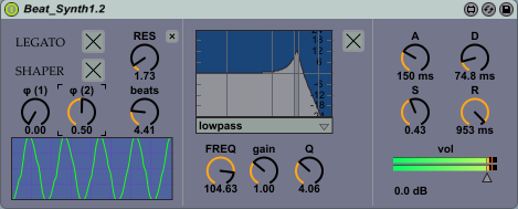 | Description: | Double oscillator synth with frequency beats control, resonant wave shaper and phase control. 1.1 *updated some minor mistakes* 1.2 longer release, better phase control. |