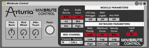 | Description: | Ableton has always been a pain for controlling external gear. Even though there's not much to control via midi for the Minibrute. I made a quick max4live midi plugin to control pitch bend, mod wheel, and after touch. I even added a nice panic button in case there's ever a stuck note as sometimes is the case with hardware. Have fun automating. ***UPDATE 1.1.0*** Now with better automation scales and better panic button. ***UPDATE 2.0*** Now includes access to all the parameters found in the editor. Firmware 1.0.3 required. |