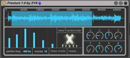 | Description: | frxtr is a spectral sampler for max4live. Using FFT it lets you select spectrum partials from the loaded sample and play. The default mode lets you choose up to six partials using 6 sliders each corresponding to a partial and one frequency selector representing the sliders. Or you can change it draw mode which lets you have unlimited partials or the ability to select wider bands from the frequency spectrum. frxtr is great for creating ambient/drone sounds quickly, but keep in mind that this is the first version and there might be some bugs. Please let me know if you came-across and i would like to hear your feedback about the patch. demo: http://youtu.be/95eCgd9waXk Read: https://medium.com/p/3b789763d8bb |