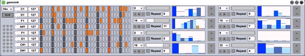 | Description: | Gammik is a drum sequencer that comes with a set of non-intrusive helpers for adding/removing/regenerating events based on probability. On the left, it is a classic drum sequencer with 32 steps and 8 different voices. On the right, there are 8 "probability" helpers that can change the content of the step sequencer. The first combo box (block size) in the "probability" helper determines the number steps to do on each cycle. If it is 8, there will be 4 cycles (4*8=32). If the 'repeat' option is selected, the first cycle will be copied in the remaining cycles; otherwise each cycle will be calculated independently. The range is used to control where you need to apply the probability (only in the beginning, at the end, in the middle or everywhere). Each time you reselect the 'block size', the probability range is applied to the complete steps of the block size. The number of item in the block zone determines how many times you need to test if the voice need to be played or not. The step value (in blue) tells when this item can be played: if it is in the middle, there is 50% to be played, if it is completely up, it will always be played, if it is on the bottom, it will never be played. '+' 'A' '-' controls the probability action on this voice. '+' will add an event; it determines the position by finding the highest probability that have not been yet selected. '-' removes an event; by finding the lowest probability that should not be selected. 'A' removes everything and re-calculates the probability of this voice. The arrow buttons does a rotation to the left or right of the current steps. |