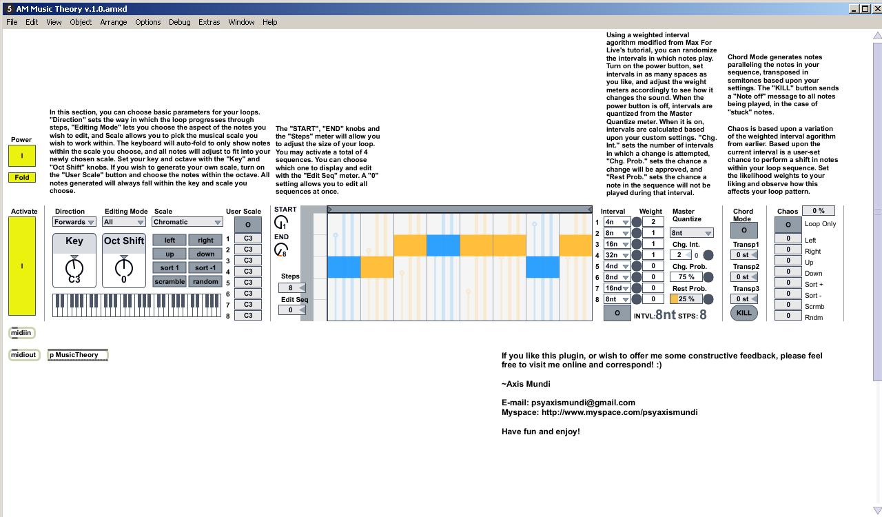 | Description: | MIDI Note Generator Plugin *Highly customizable MIDI loop generator plugin. *Set key, scale (almost 50 to choose from with user scale options added), velocity, note probability, progression, and more. *Step sequencer automatically folds its keyboard to fit the scale you work in *Weighted probability algorithms set aspects such as randomization, note variation, and trigger timing. *Chord and Chaos modes allow you to further evolve your sequence for further improvisational, live, loop generation possibilities. *Optimized for use with the APC40 Feel free to offer me some feedback! |