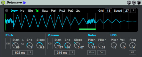 | Description: | Betawave is a percussion synthesizer featuring a oscillator wave shape sequencer (Think of how one would create drums on a Commodore 64.) Designed as a drop-in synth for Ableton's drum rack. Example videos http://www.youtube.com/watch?v=6MYZ0OxrVoM and http://www.youtube.com/watch?v=ZgcljRvjbuo |