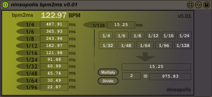 | Description: | ninsopolis bpm2ms v0.01 - improved bpm2ms util * tied to transport for instant updates * readouts in floating point * 1/4 note - 1/128 note * 1/6, 1/12, 1/24 note (time in 3s) readouts as well * simple calculator for on-the-fly math'n usage: insert into a track. |