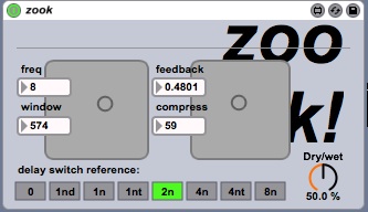 Description: zook is a pitch shifter/variable delay working on random but quantized values based on tempo. The pitch shifter work buffer feedback can be set to extreme values so no input is not needed anymore. This "experiment" was an orginal hack of the "pitch shifter" example patch in pure-data: http://le-son666.com/asb2m10/03-zook.pd