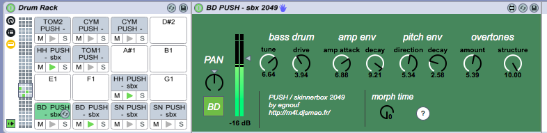 | Description: | PUSH Skinner Box V1.0 (6th January 2014) ;;;;;;;;;;;;;;;;;;;;;;;;;;;;;;;;;;;;;;;;;;;;;;;;;; Below you will find a list of 6 drum synth modules to download. Those modules are coming from the SkinnerBox plug in (the famous skinner 2049 drum synth). I decomposed SkinnerBox code to create 6 different modules: BD, SN, HH, CYM, TOM, etc. You can add each of this module into your DRUM RACK, and PLAY with your PUSH CONTROLLER with it!! All the parameters are tweekeable from the PUSH screen. The push sequencer works with it, etc... ** VIDEO here: http://www.youtube.com/watch?v=S1mXfKtY94U&feature=youtu.be PS: Of course, you don't need PUSH to play with the modules but your user experience will be better ;-) ;;;;;;;;;;;;;;;;;;;;;;;;;;;;;;;;;;;;;;;;;;;;;;;;;;;;;;;;;;; ** Use this patch to create very nice NEW DRUM SOUNDS :-) ** Big thanks to Skinner Guys!! I just took their codes & tried to make a new patch using their excellent work! ;;;;;;;;;;;;;;;;;;;;;;;;;;;;;;;;;;;;;;;;;;;;;;;;;;;;;;;;;;; Instructions --> 1- Uncompress the file called "PUSH Skinner Box.zip" & copy the folder into your ableton preset folder, 2- Open an empty drum rack & insert on each cells the different drum synths modules :-) I added a drum rack example called TR606. Enjoy! ;;;;;;;;;;;;;;;;;;;;;;;;;;;;;;;;;;;;;;;;;;;;;;;;;;;;;;;;;;; Support me and donate, a little sum is enough! Thanks! |