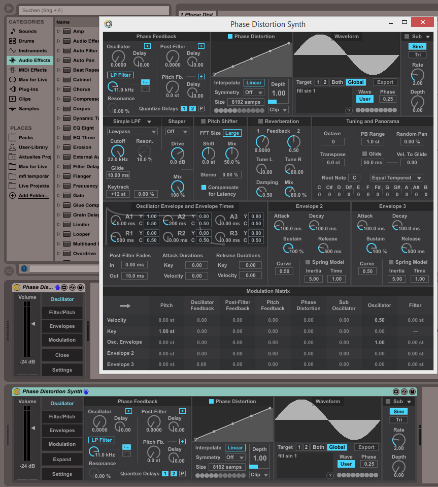 | Description: | Currently this synth doesn't seem to be working with Live 10. Please back up your project if you decide to try it out in that version. Using the synth in Live 9 shouldn't be a problem. This is my (first, finished) synthesizer. It is a polyphonic wavetable synthesizer using various techniques of phase distortion in a feedback loop. It's got some virtual analog filters and a 5x8 modulation matrix, as well. To see what each control element does, refer to Live's info view; the device is fully annotated. I've also included a diagram to explain the signal flow. (The sections in the "Oscillator" and "Filter/Pitch" tabs are more or less signal-path-explicit.) As a starting point, I would suggest turning up the "Post-Filter" knob in the "Phase Feedback" section, then maybe play with the filter settings. I used various bits and pieces from the gen~ examples included with Max and from the forums. In particular, the filters are not my work but were created by Andrew Simper, the ICST and Dominique Wurtz, and ported to Gen by stkr, Peter McCulloch and Oli Larkin. The device takes a while to load, especially with greater polyphony. There is, I guess, hope this will change with a future Max update. The device is free. If you'd like to reward me financially, that would of course be greatly appreciated; you can do so here: https://www.paypal.com/cgi-bin/webscr?cmd=_s-xclick&hosted_button_id=XNDYJ5LA2PAHY Version 1.1 contains fixes for dropping audio files to the Phase Transfer and Waveform buffers. |