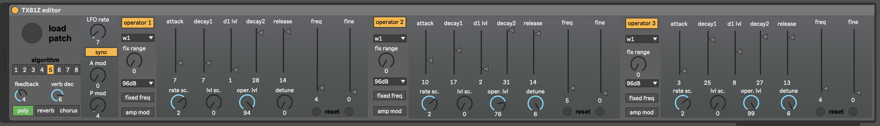 | Description: | ---NOW UPDATED FOR LIVE 10--- **Previous compatibility problems with this device SHOULD have disappeared with the addition of Sysex to Live 10 -------------------------------------- Editor for Yamaha TX81Z with sysex parameter exchange and full parameter recall of presets. make sure these settings are correct on your TX81Z (Utility -> midi control): - Exclusive: ON - Receive CH + Transmit CH must be set to 1 (ONE) - connect TX81Z and Computer via midi BOTH WAYS - drop the M4L device on a midi track in Live - set up ins and outs on midi channel in Live - make sure live is monitoring the midi in (monitor in, or record enable) - Choose a preset on the front panel of the TX81Z and press LOAD on the editor. All parameters should now take their positions from the chosen preset. |