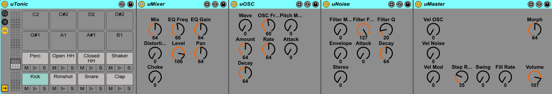 | Description: | This Drum Rack contains a few M4L Patches to control the VST. Using the External Instrument device only doesn't fit my need because i want to select a cell and adjust the parameters without diving into many menus and other restrictions. 1) Load the Drum Rack 2) Activate "Select Channel with MIDI" in the Top Section 3) If necessary: open Microtonic and import Midi Mapping (Drum Rack Default.drccmap) 4) Play with it This is my first device so when i get more knowledge i will make it: - beautiful - controlling more functions - maybe adding FX racks I also done this for: D16 Drumazon - http://www.maxforlive.com/library/device/2259 D16 Nepheton - http://www.maxforlive.com/library/device/2262 Recommendations and Ideas are welcome! v1.2 Changes - Split up from one into four devices for better access with Push |