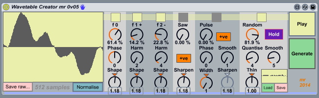 | Description: | Max uses 512 sample 'wavetables' in many of its examples for single cycle waveforms. Making them from scratch can be awkward and time consuming, so here's a utility that does just that. You select a sound source using the selection boxes at the top, click 'Generate' and listen to the result. If you like what you see/hear, then you can save the waveform as a cross-platform .WAV file. To aid in the production of multiple waveforms for use in wavetables, then the 'Random' source has a 'Hold' feature that allows you to capture (and save/load) the waveform from just that section and keep it constant whilst you change the other sources. It is possible to play the sounds using Live, but the playback is monophonic and has a fixed envelope. Maybe this is a prototype of the oscillator section for a forthcoming full synthesiser? |