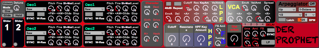 | Description: | This is the first version of my prophet12 editor. at the moment all all CC#s are assigned, but I`m planning on making this the ultimate prophet editor :-)! bidirectional, with all parameters + additional step sequencers and an enhanced modulation matrix. but first i have to figure out how this NRPN thing is working in max. even now there are a few knobs (3 or 4) which aren`t functioning because they are only accessible via NRPN, but i included them for GUI design reasons. actually i`m pretty bad with GUI designing. SO IF SOMEBODY WANTS TO HELP ME OUT WITH THE NRPN`S AND THE GUI DESIGN IT WOULD BE GREAT!!! |