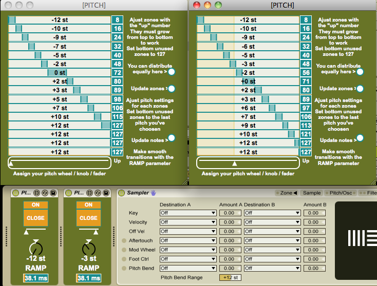 | Description: | This device allows you to use pitch bend but only with notes you've choosen. Pitch bend response of your synth/sampler must be set to 12st. Follow instructions in the device and use any fader/knob/wheel to pitch in scale. Enjoy and share ! V.2 / Added on the device window a fader linked to the one in floating window + Now you can add many of these devices without trouble My way : I put a sample on sampler,don't forget to set its pitch bend range to 12ST, put many PITCH IN SCALE with different settings and try them |